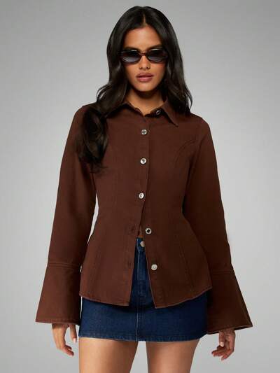 MISSGUIDED Brown Denim Button Up Shirt With Bell Sleeves