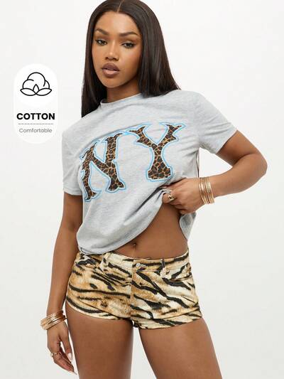 SUMWON WOMEN NY Logo Animal Print Everyday Casual Tee Leopard Graphic Short Sleeve Unisex Fit Cotton Jersey Basic T-Shirt