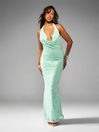MISSGUIDED Mermaid Sequin Halter Neck Backless Long Gown