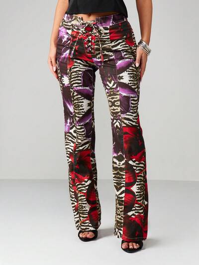 MISSGUIDED Mixed Animal Print Lace Up Flare Jeans