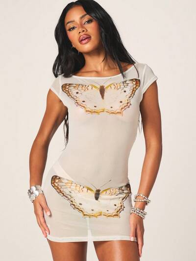 MISSGUIDED Sheer Mesh Dress With Butterfly Print-30%