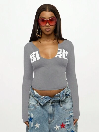 SUMWON WOMEN Long Sleeve Crop Top With V Neck Letters Brand Print Casual Fall Winter Slim Fit Leisure Street Style Tee Shirt Everyday Essential Basic Layering Piece Party Club Wear
