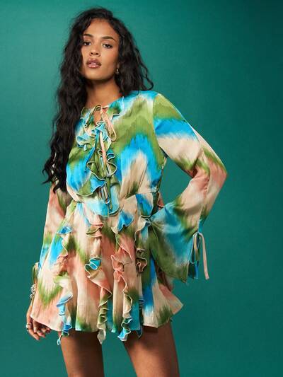 MISSGUIDED Minikleid aus Satin mit Aquarelldruck, Rüschendetails und Glockenärmeln
