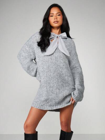 AiiRZ Elegantes gestricktes Mini-Sweaterkleid mit Langarm, Vorderteil-Bindedetail, für Winter, Herbst, Partys, Abende, Lässig, Feiertage, Hochzeitsgäste