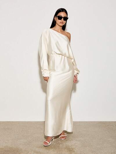 AiiRZ Ein-Schulter Asymmetrisches Maxikleid mit Langarm, Empire Taille, elegantes Brautgast Kleid für besondere Anlässe, formelles Abendkleid für Winter Feiertage und Ballpartys-50%