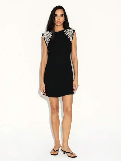 KSTM Verziertes schulterfreies schwarzes Minikleid mit silbernen Flügeldetails, ärmelloses Bodycon-Abendkleid für Partys, formelle Anlässe und DatesCode: SAVE25