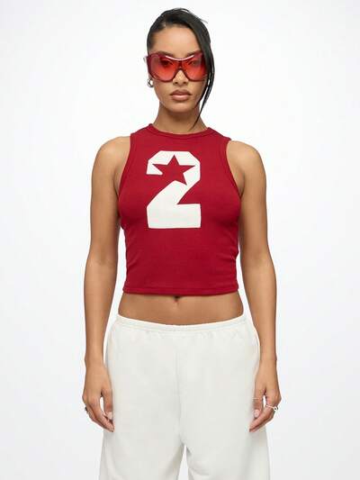 SUMWON WOMEN Retro Athletisch Nummer 2 Stern Crop Tank Top Ärmelloses Geripptes Sport Tank Top Team Trikot Stil Sportlich Sommer Workout Gym Mode Tank-50%