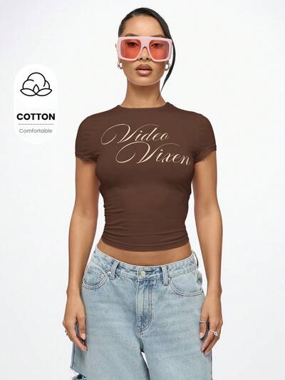 SUMWON WOMEN Vintage Stil Schrift Logo Baby T-Shirt taillierter Crop Top Sommer Festival Streetwear Baby T-Shirt Y2K Mode Essentiell Grafik Muster10,86 $12,07 $