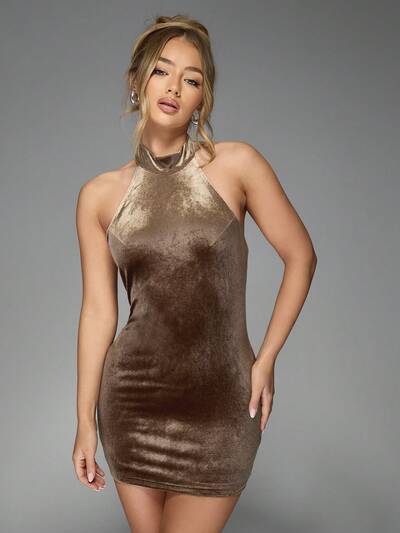 MISSGUIDED Samt Polo Neckholder rückenfrei Bodycon Minikleid-55%