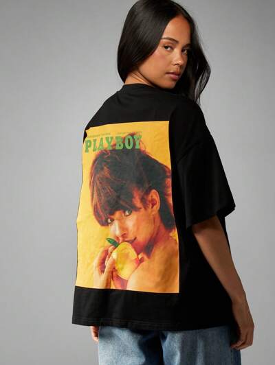 Missguided x Playboy Übergroßes schwarzes T-Shirt mit Magazin-Cover-Print auf der Rückseite-40%