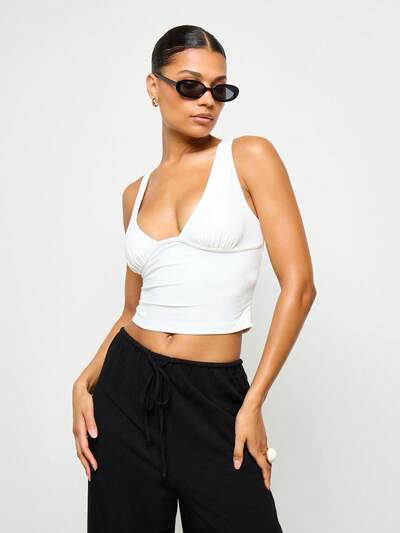 KIZN Texturiertes gerafftes ärmelloses Trägertop mit drapiertem V-Ausschnitt, Partykleidung, Sommer, schlanke, figurbetonende Clubwear, festliches Crop Top-10%