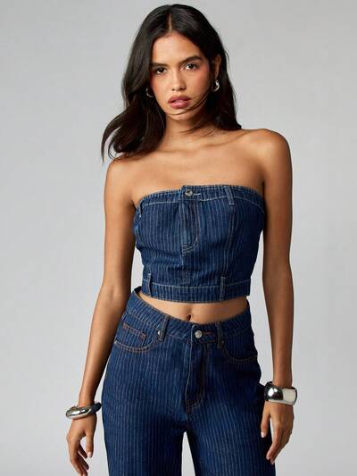 MISSGUIDED Trägerloses Bandeau-Top aus Denim mit Nadelstreifen-50%