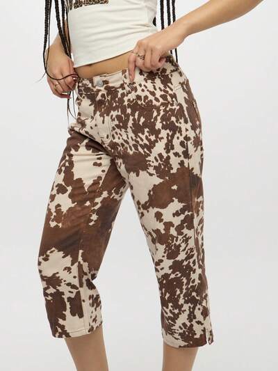 SUMWON WOMEN Designer Capri-Jeans mit Kuhfleckenmuster im Western-Ranch-Stil, mittlere Bundhöhe, Baumwolle mit Stretch, Lässig Crops, Bauernmode Statement Hose-55%