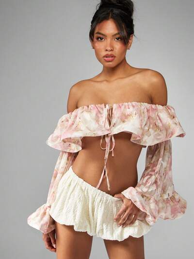 MISSGUIDED Schulterfreies Rüschentop aus Chiffon mit Blumenmuster und Puffärmeln-50%