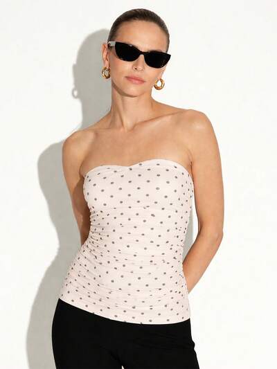KSTM Gerafftes Polka Dot Bustier-Top trägerloses Bandeau-Top weiß schwarz gepunktet Röhrenshirt Lässig Sommer Party