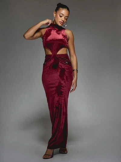 MISSGUIDED Samt-Maxikleid mit hohem Kragen, Cut-outs und Metalldetails – Weihnachten-50%