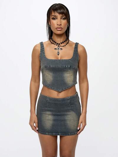 SUMWON WOMEN Premium Denim Minirock, hochgeschnitten, figurbetonend, vintage gewaschen Y2K Retro Festival Sommer Party Clubwear, verwaschen und abgenutzt-55%