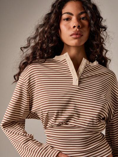 AiiRZ Gestreiftes Langarm-Henley-Oberteil mit kontrastierendem Kragen, Knopfleiste, lässiger gerippter Strick-Pullover-Hemd für Herbst und Winter-30%