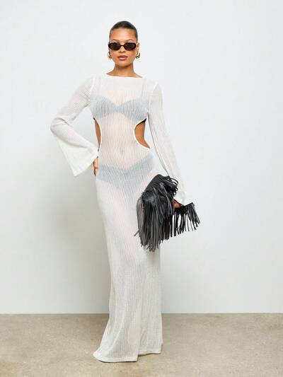 AiiRZ Gehäkeltes Maxikleid Strandmode Cover-Up mit Glockenärmeln und offenem Rücken, Sommer Pool Resort Luxus Cover-Up, Weiß
