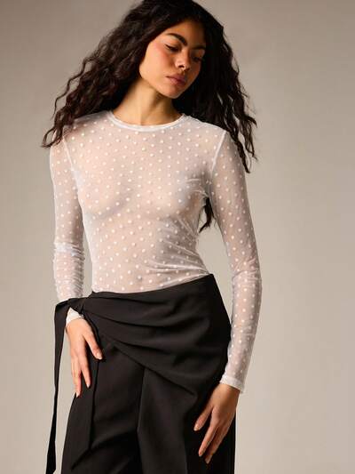 AiiRZ Polka Dot transparente Mesh Langarm Bluse mit rundem Ausschnitt und anliegender Silhouette für Herbst Winter Party und Abendanlässe