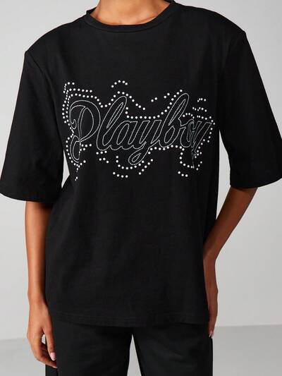 Missguided x Playboy T-Shirt mit Strass-Schriftzug und Glitzerdetail-40%