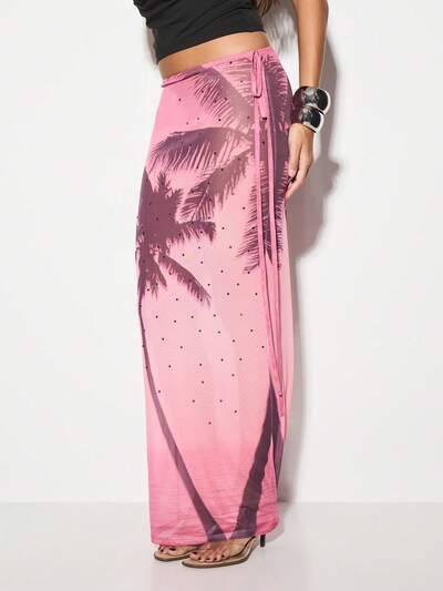 KIZN Pareo de playa estampado con sombras de palma y lunares, falda larga de verano, prenda para cubrir el traje de baño ideal para vacaciones en la playa y resort