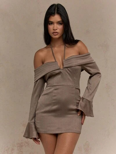 MISSGUIDED Vestido corto Bardot de manga larga con campana, de satén texturizado, con tirantes cruzados