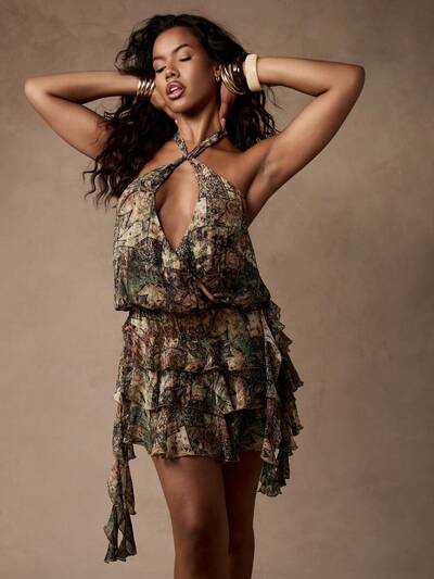 MISSGUIDED Vestido mini fluido de gasa con volantes y estampado paisley, cuello halter y capas