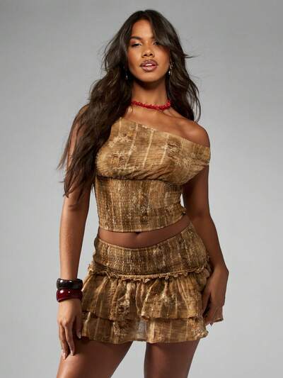 MISSGUIDED Conjunto de top corto con falda y volantes con hombros descubiertos y estampado de serpiente de diseñador