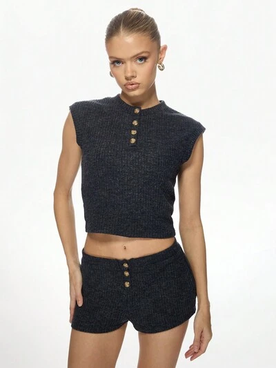 MISSGUIDED Conjunto de top corto con botones delanteros de punto acanalado y pantalones cortos de cintura alta