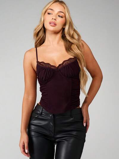 MISSGUIDED Camisola estilo corsé fruncido de malla con detalle de encaje