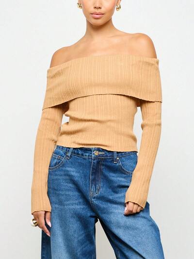 SUMWON WOMEN Blusa de punto con hombros descubiertos, manga larga, detalle acanalado y hebilla como accesorio para uso casual en otoño e invierno