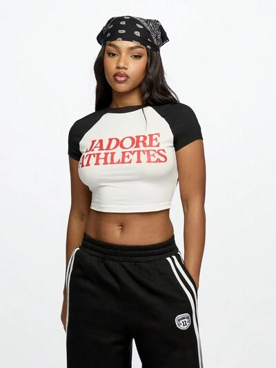 SUMWON WOMEN Top corto de verano esencial para festival: Camisa corta de algodón de manga corta estilo raglán, con gráfico en bloque de color, ajustada y casual