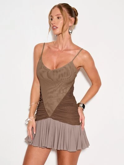 KIZN Vestido mini con paneles de malla, tirantes de espagueti, detalles fruncidos y dobladillo plisado para una cita nocturna de veranoNUEVO