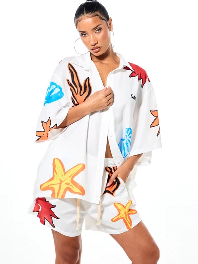 SUMWON WOMEN Pantalones cortos con pliegues de malla estampada con detalles de lazos laterales, cintura alta para festivales, verano y fiestas en la playa