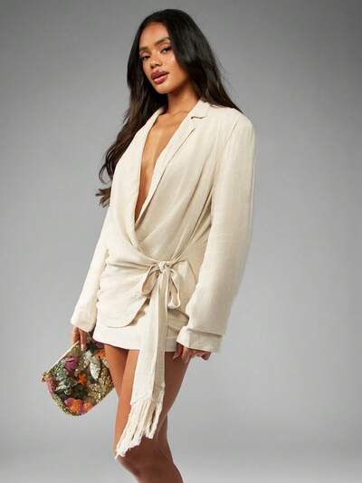 MISSGUIDED Elegante blazer cruzado de lino con mangas largas y detalle de flecos