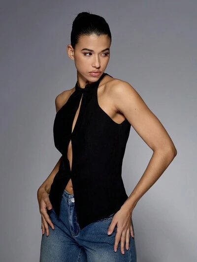 MISSGUIDED Top corto asimétrico de cuello alto con botones y sin mangas para mujer-50%
