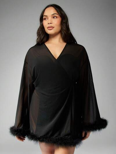 MISSGUIDED PLUS Bata de talla grande con malla transparente y ribete de plumas
