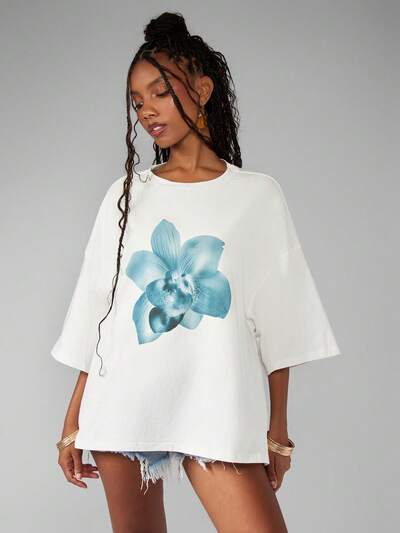 MISSGUIDED Camiseta informal de gran tamaño con estampado gráfico de orquídeas-50%