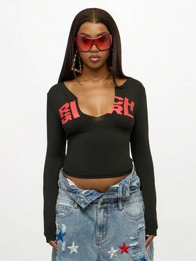 SUMWON WOMEN Camiseta gráfica holgada y caída con hombros descubiertos y texto impreso, top casual para festivales de verano19,59 US$21,77 US$