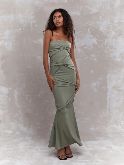MISSGUIDED Vestido largo sin tirantes con detalles de nudo retorcido, ideal para Navidad