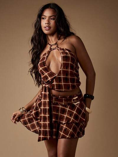 MISSGUIDED Minifalda de corte A con estampado de cuadrícula de terciopelo y ribete de volantes