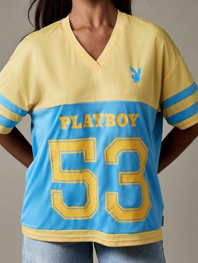 Missguided x Playboy Camiseta de fútbol universitario con cuello en V y número del equipo-45%