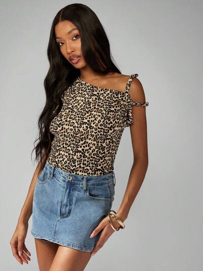 MISSGUIDED Top informal de punto acanalado con estampado de leopardo y lazo en los hombros