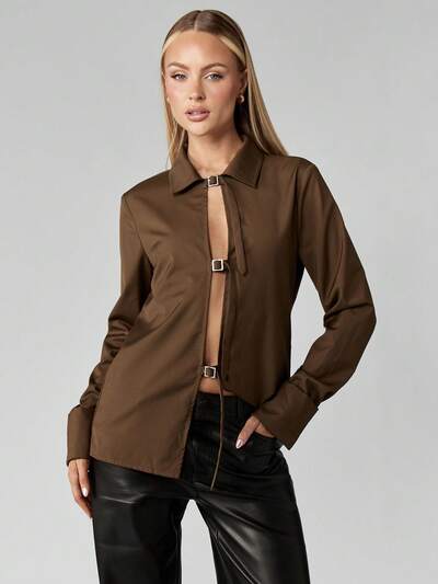 MISSGUIDED Camisa de popelina con hebilla delantera y mangas largas