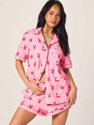 Missguided x Playboy Pijama con estampado de conejito afrutado, top abotonado y pantalones cortos-30%