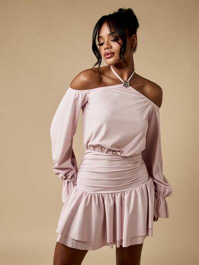 MISSGUIDED Minivestido con hombros descubiertos, manga larga, cintura fruncida, cuello halter y dobladillo con volantes-40%