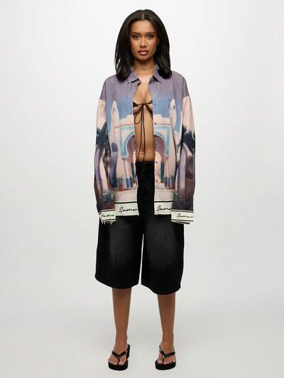 SUMWON WOMEN Chemisier Top décontracté avec imprimé paysage, manches longues, collection pour villégiature, vacances de luxe, été, loisirs, port de plage, boutonnage devant, porté en voyage