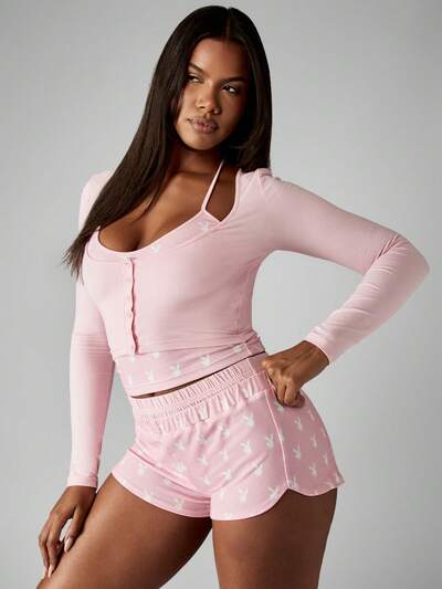 Missguided x Playboy Haut court boutonné à manches longues avec short à taille élastique-55%