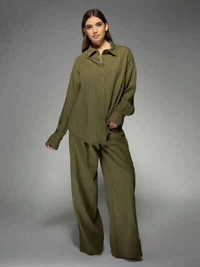 MISSGUIDED Ensemble deux pièces chemise oversize rayée en lin et pantalon large